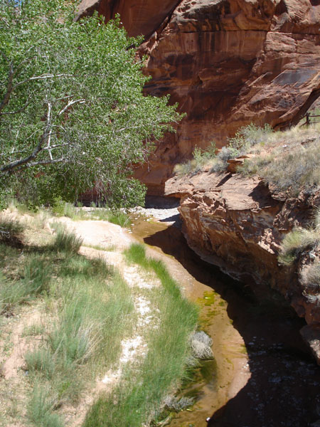 Description: Small spring flows into wash. Spring water has high concentrations of carbonate leaving white mineral deposits on streambed sand and gravel. Associated vegetation with a desert water source is cottonwood trees, tamarisk, and scattered emergent marsh. |