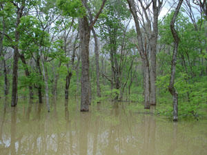 Description: Forested Wetland in the White River floodplain. The bottomland hardwood forest consists of Green Ash, Water Hickory, and Overcup Oak. Water depth on the floodplain is about 11 feet from the spring flooding. |