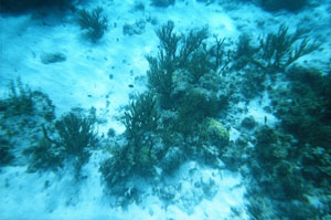 Description: Patchy coral reef with live bottom sponges and soft corals. Picture taken three weeks after Hurricane Isaac past over Grande Caymen. Note the sand deposits on top of the coral. Water depth roughly 15 feet. |
