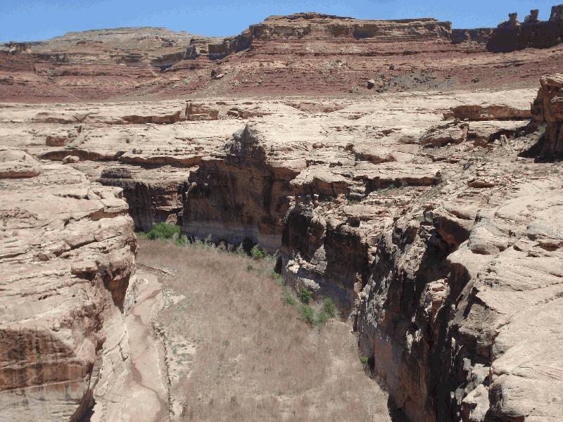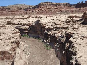 Description: Palustrine floodplain of the Dirty Devil River is dominated by dead Sandbar Willow scrub-shrub. A few live Cottonwood trees are along the sides of the canyon wall. The Dirty Devil River is dry in summer. |