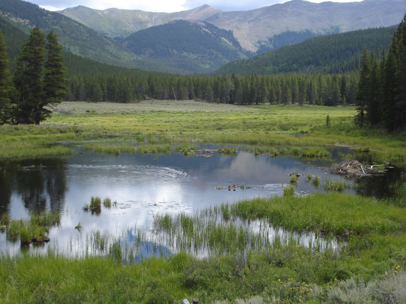 Description: Beaver ponded wetland. Inactive, old beaver pond with remnant beaver dam and house. Wetland is shallow open water that is being filled in with sediment;emergent fresh marsh of Scirpus spp. and Carex spp. in wetter areas, with scrub-shrub of willow (Salix spp.) on drier saturated areas. |