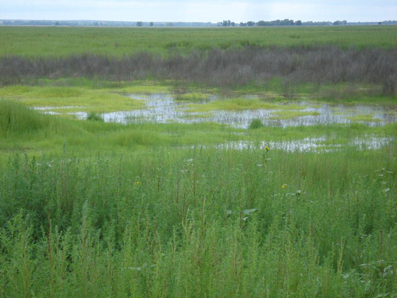Description: Emergent freshwater marsh of cattails, Scirpus spp., Velvetleaf, and burningbush. Refuge is managed for shorebirds, wading birds, and migratory waterfowl. The area is actively managed for open water and wetland emergent marsh habitat communities. After two years of severe drought the pools dried out and were overtaken by cattail and burningbush. The water present is from 5 inches of rain in the past three days. |