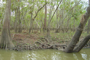 Description: Forest Wetlands of Water Tupelo on floodplain and Bald Cypress along streambank. Water line on tree trunks shows depth of recent flooding. |