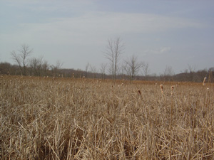 Description: Freshwater bog of emergent herbaceous marsh, dominated by Cattail. Bog exists from localized rainfall and has an outlet stream. |
