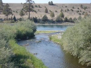 Description: Crow Creek in late summer low flow at confluence with Flathead River. Wetland scrub-shrub of willow, with herbaceous emergent fresh marsh along edges of channel. |