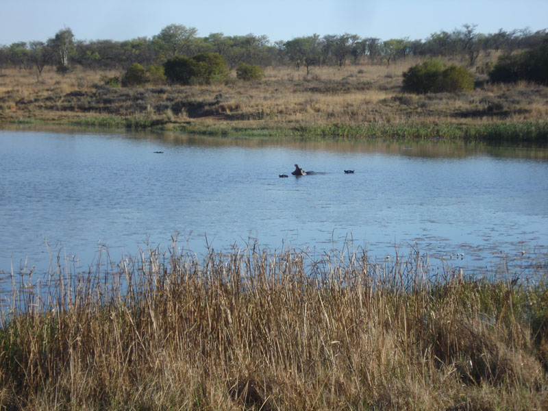 Description: Freshwater impoundment for game animals on the Entabeni Conservation Reserve. Hippopotamus in water. Fresh marsh of Scirpus spp. and Typha spp. show signs of grazing by Hippopotamus above water level. |