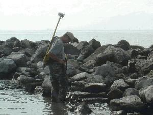 Description: Rock Breakwater/Jetty, man-made Rocky Shore of Rubble sized material. Lower darker rocks are Intertidal, regularly flooded by the tide. Lighter rocks (about knee high) are Intertidal, Irregularly flooded. |