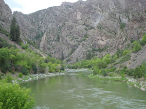 Description: Stream Channel of the Gunnison River just below the East Portal Diversion Dam. River level fluctuates with Spring snow melt as shown by the higher water marks on the channel banks. |