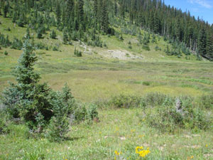Description: Mountain Meadow depression with emergent herbaceous vegetation occupying the depression. Vegetation is thicker, slightly taller, and darker in the portion of depression where surface water remains the longest. Wetland Scrub-shrub surrounding marsh on slightly drier but saturated ground. |