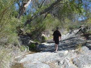 Description: Streambed within a larger intermittent wash. Water in streambed is from a small spring that is fed by gravity flow from hills to the south of the wash. Flow in early fall is low, but is valuable oasis in desert for wildlife. Cottonwood trees and sandbar willow grow on floodplain of the wash. |