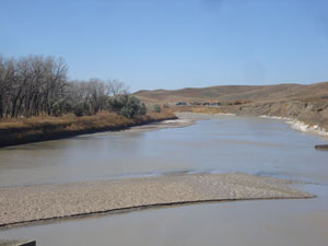 Description: White River channel with sand bars. Four days after a rain, river flow is higher than normal, carrying sediment. Vegetation on floodplain terrace is cottonwoods with willow scrub-shrub on gravel/sand bars and banks. |