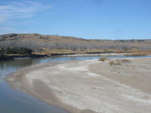 Description: A prograding gravel/sand bar in channel bend that is forcing a deep cutbank on south side of river channel. Cottonwoods and juniper vegetation on floodplain terrace. |