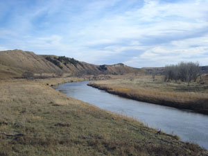 Description: Incised river channel into floodplain. Cottonwoods on terrace and small scrub-shrub willow on lower floodplain. |