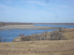 Description: Main channel of the Missouri River north of Bismarck. Large sand bars present in photo. Fall low flow in channel. |