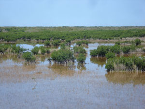 Description: Saltwater Wetland Scrub-shrub of Red Mangroves. Spartina patens is present in shallow lagoons. The Ten Thousand Islands are principally made up of clumps of Red Mangrove. |