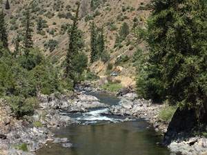 Description: Lake fork of the Gunnison River flows north from the San Juan Mountains to the Gunnison Rive through a deep v-shaped valley. The river bed is bedrock, boulders, and cobble sized material with riparian willow and spruce scrub-shrub growing on the bars and banks. |