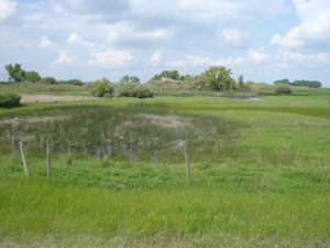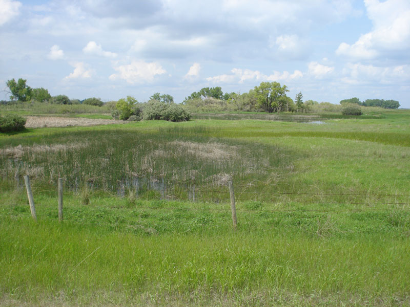 Description: Series of Prairie Potholes in glacial till region of Eastern Alberta. Pothole in foreground is shallow and holds water in spring; it is hayed later in summer. Potholes in background are in various stages of succession with emergent herbaceous vegetation of cattails and spike rush, some open water, and, in the distance, fringing wetland scrub-shrub. The forested areas are on higher knolls adjacent to the potholes. |