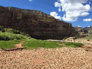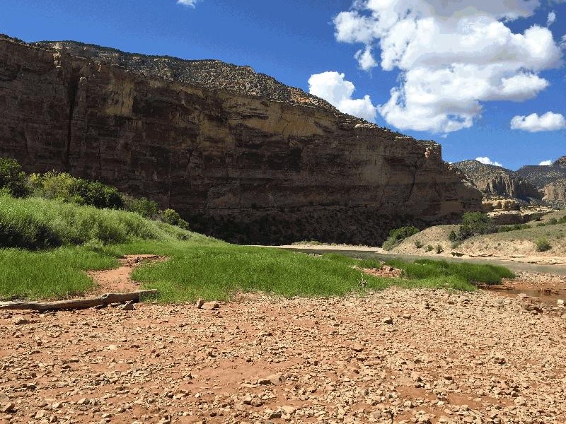Description: Green River at Echo Park. Gravel bar at the mouth of Pool Creek, vegetated at edge of river with emergent fresh marsh of Cattails, Scirpus, and Timothy. Higher portion of bar and adjacent bank is vegetated with Sand Bar Willow and Cottonwoods. |