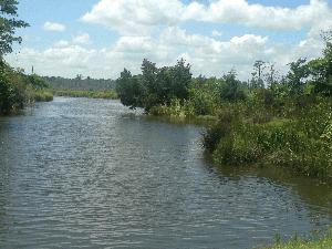 Description: Salt marsh of juncus along edge of channel with a fresh swamp of Atlantic White Cedar and cypress. |