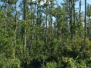 Description: Forested wetland of young cypress with scrub-shrub understory. Ground surface in forest is very hummocky with standing groundwater in low areas. |