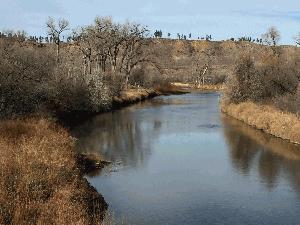 Description: Stream channel banks covered with emergents with floodplain vegetated by old Cottonwoods, and scrub-shrub Willow and oaks. |