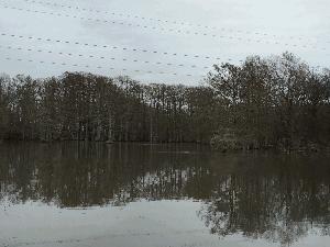 Description: Old meandering stream on Arkansas River floodplain has been cutoff for agricultural fields. This portion of stream is filled in with Cypress forest and some areas of scrub-shrub and ponded shallow water. |