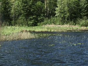 Description: Fresh marsh of cattails fringing shallow water edge of lake with pond Lily's rooted in sand bottom. |