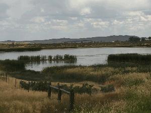 Description: Depression with slightly alkaline open water, cattails and Scirpus growing in the depression's shallow water margin. Submerged aquatics and Open water being utilized by waterfowl and Trumpeter Swans. |