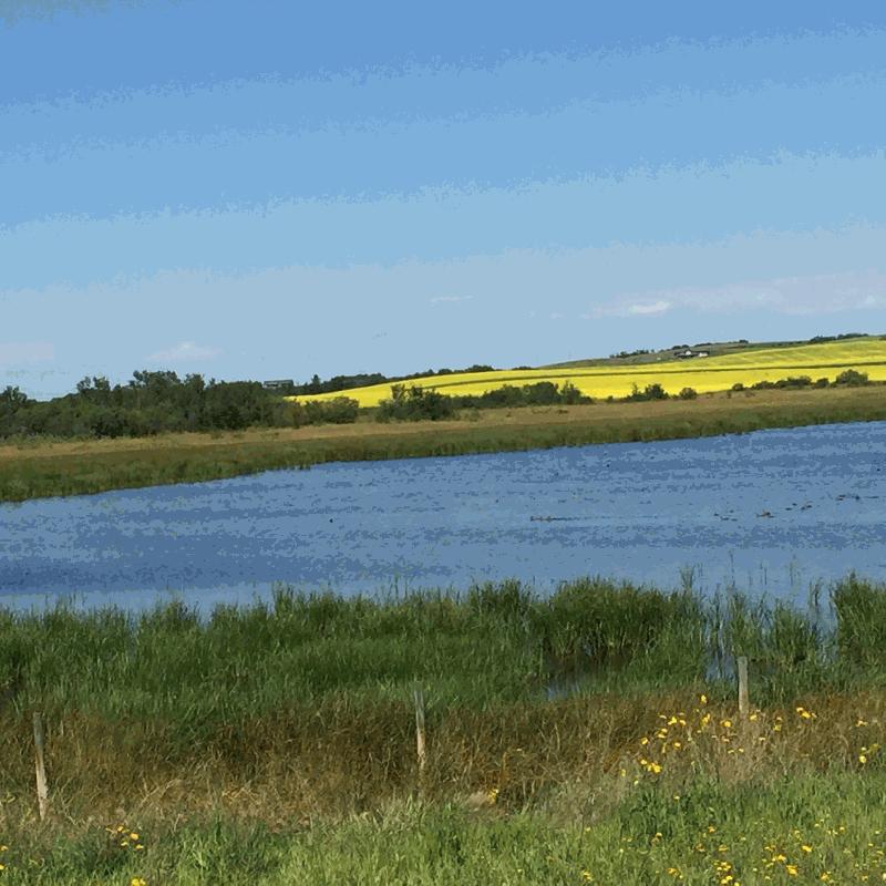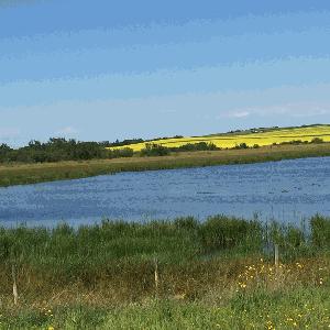 Description: Prairie pothole with open water and cattail fringe. Canola field in bloom in distance on ridge. |