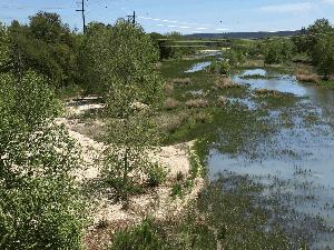 Description: Streambed with over 30% coverage of rooted vascular vegetation. Channel bars and banks vegetated with cottonwoods and sand bar Willow. |