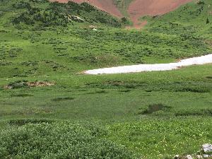 Description: Snowfield late summer, not totally melted. Growing season shorter this year; snow not melted off the wetland until mid-July. |