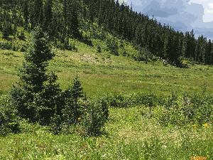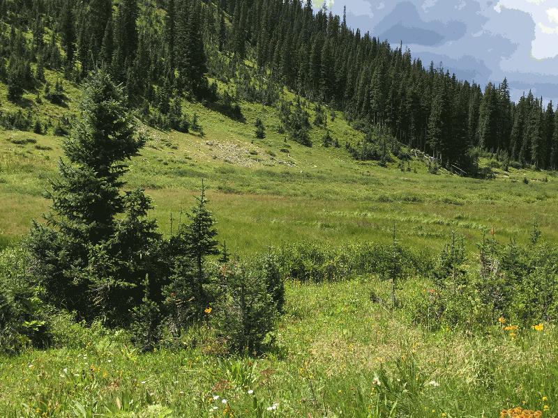 Description: More evidence of standing water in pockets of fresh marsh and of saturated soil throughout basin. Snow melt has been late this year, was on the slopes on the west side of this basin until beginning of August. |