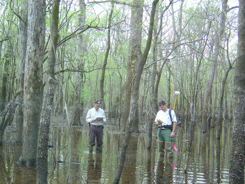 Description: Bottomland Hardwood Forest of predominantly broadleaf deciduous trees over 20 feet in height with a few cypress (narrowleaf deciduous) trees present. Semi-permanent water is present in pockets for most of the year. Waterline from spring (March and April) flooding of the Lower White River is evident at about 4 feet above the water surface. |