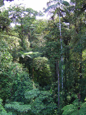 Description: Tropical rainforest on Carribbean Sea side of the Central Corrdiero. Area receive 150 inches of rainfall; trees are Broadleaf Evergreen. The upper canopy is at 110 feet high, with a middle canopy at 65 - 70 feet. Ground remains saturated at or near the surface for most of the year. |
