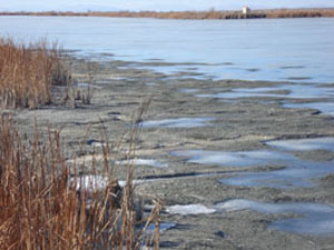 Description: Exposed shoreline and mudflats during winter low water conditions. |