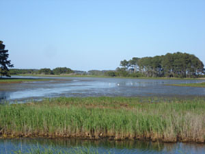 Description: Shallow freshwater area of Black Duck Marsh with fringing fresh marsh of cattails and scirpus. Wading birds are in the shallow water area and migratory waterfowl are in the deeper openwater. Upland pine forest is on higher sand ridges within the marsh. |