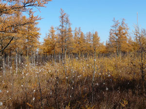 Description: Palustrine forested wetland dominated by mixed-height tamarack growing on a floating mat of sphagnum moss. The water regime is saturated year-round. |