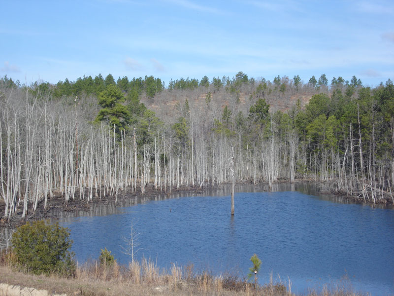 Description: Impounded palustrine pond permanently flooded, less than 20 acres in size, with dead deciduous forest. The deciduous trees were primarily Ash and Red Maple, although a few scattered dead loblolly pines can be seen. |